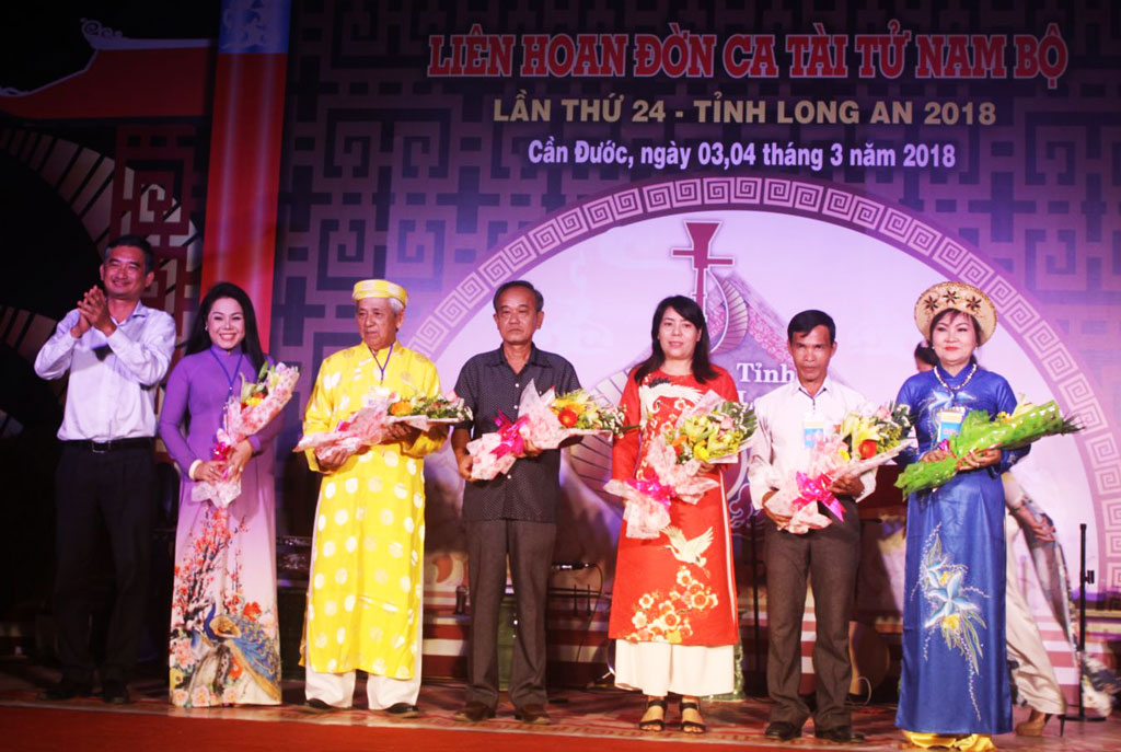 Phó Chủ tịch UBND tỉnh - Phạm Văn Cảnh tặng hoa cho các ban đờn ca tài tử tỉnh bạn tham gia Liên hoan