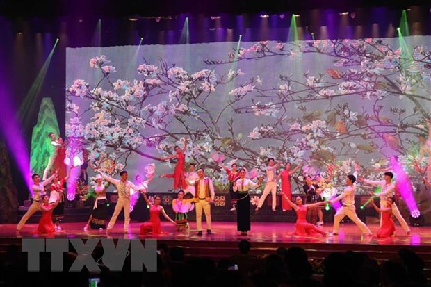 Tiết mục biểu diễn nghệ thuật với chủ đế Sức sống Sơn La. (Ảnh: Hữu Quyết/TTXVN)