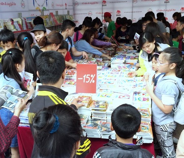 Gian hàng của Nhà xuất bản Kim Đồng tại Hội sách thu hút nhiều độc giả nhí (Ảnh: infonet.vn)