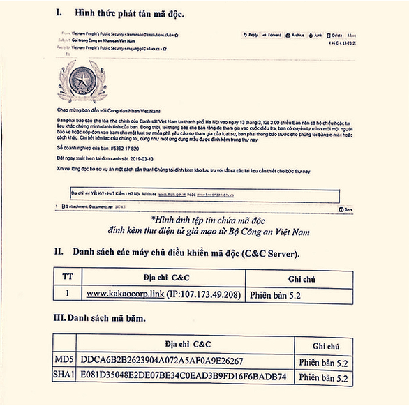 Trung tâm Ứng cứu khẩn cấp máy tính Việt Nam (Trung tâm VNCERT) vừa có công văn khẩn gửi đến các cơ quan, tổ chức tài chính, doanh nghiệp… trong cả nước thông báo về việc VNCERT vừa phát hiện chiến dịch phát tán mã độcGandCrab 5.2 vào Việt Nam qua email giả mạo Bộ Công an.