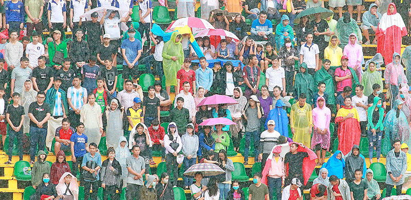 Khán giả dầm mưa để xem trận đấu giữa Cần Thơ với Hoàng Anh Gia Lai trên sân Cần Thơ. Ảnh: NGUYỄN MINH