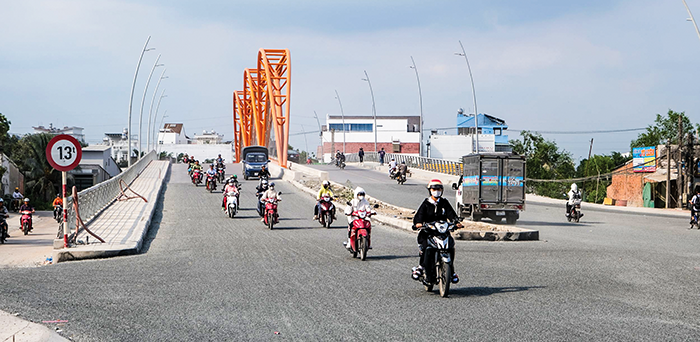 Dự án cầu Cờ Đỏ trên đường tỉnh 919 với tổng mức đầu tư (điều chỉnh) gần 133 tỉ đồng, khởi công vào tháng 2-2022. Tổng chiều dài tuyến hơn 369m; trong đó phần cầu Cờ Đỏ dài hơn 83m và còn lại là đường dẫn. Cầu có thiết kế gồm 2 đơn nguyên, mặt cắt ngang cầu gồm 6 làn xe, rộng 31m; vận tốc thiết kế 40 km/giờ. Kiến trúc cầu được bố trí vòm thép, cùng dây văng kết hợp hệ thống chiếu sáng nghệ thuật tạo mỹ quan cho cầu. Đơn nguyên bên phải tuyến đã hoàn thành và thông xe vào tháng 6-2023. Đơn nguyên bên trái tuyến hoàn thành bê tông cốt thép bản mặt cầu, bê tông cốt thép tường chắn, gờ chắn bánh và lắp dựng lan can mạ kẽm. Phần đường dẫn vào cầu thi công xong bê tông cốt thép tường chắn và lắp dựng lan can mạ kẽm. Bên cạnh đó, thi công xong hệ thống thoát nước dọc; cấp phối đá dăm đường vào cầu. Hiện đang thi công đường dân sinh hai bên cầu. Theo kế hoạch từ nay đến ngày 30-4-2024, đơn vị thi công đang tập trung hoàn thiện cấp phối đá; thảm bê tông nhựa nóng mặt cầu; đường vào cầu và đường dân sinh hai bên cầu…