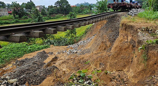 Cụ thể về tình hình sạt lở tuyến đường sắt Hà Nội - Lào Cai: Đêm 6/10, tại khu gian Ngòi Hóp - Mậu A thuộc tuyến đường sắt Yên Viên - Lào Cai, một số điểm bị trôi nền đường, sụt sạt ta luy nền đường, đất đá trôi lấp mương rãnh và tràn vào lòng đường; sạt lở rãnh cáp gây hư hỏng đường cáp chôn ngầm thông tin tín hiệu.