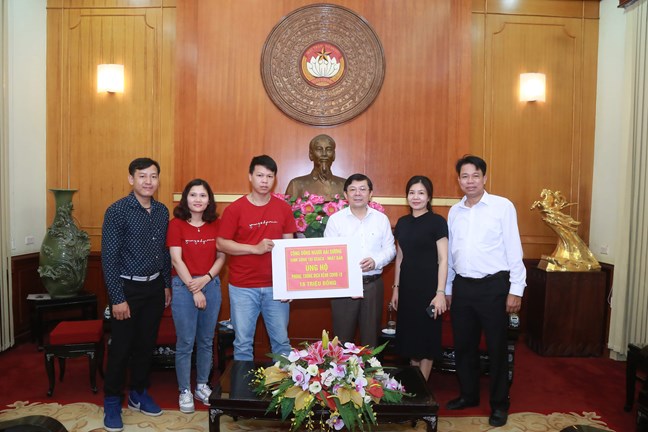 | Phó Chủ tịch Uỷ ban Trung ương MTTQ Việt Nam Nguyễn Hữu Dũng tiếp nhận ủng hộ. |