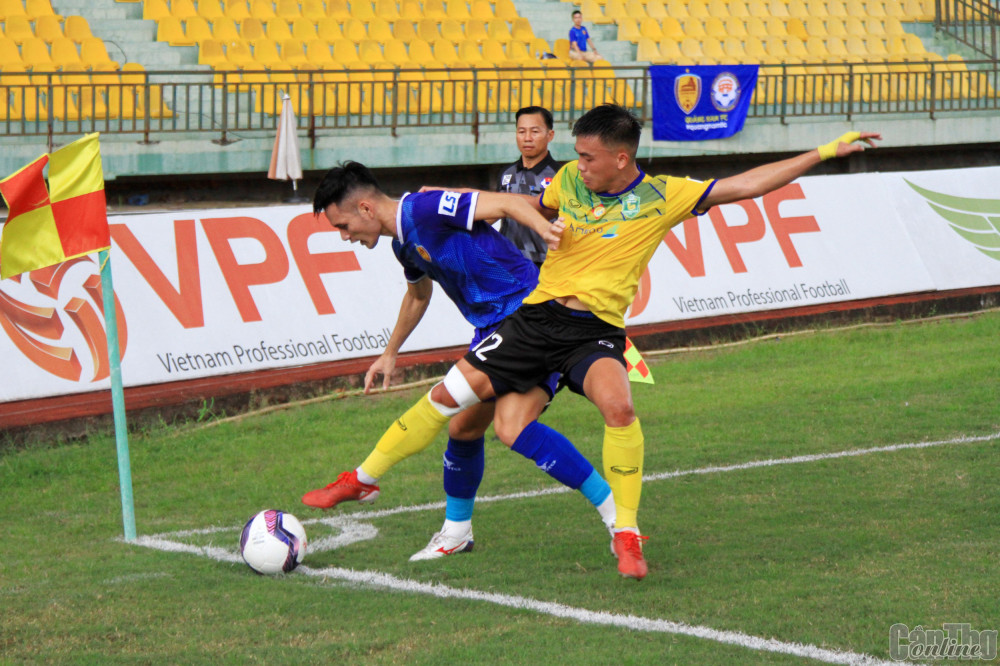 Cầu thủ Cần Thơ (phải) tranh bóng với cầu thủ Quảng Nam trong trận đấu ở vòng 21.