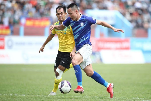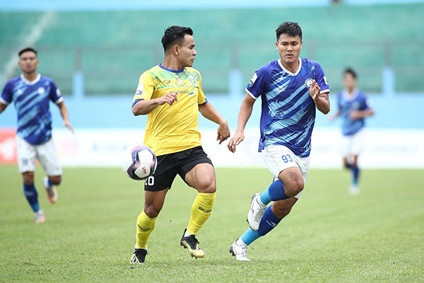 Cầu thủ Cần Thơ (áo vàng) đua với hậu vệ Khánh Hòa. Ảnh: KH FC