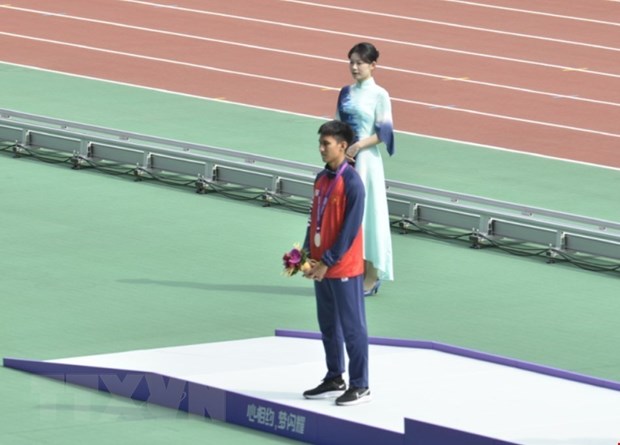 Vận động viên Phạm Nguyễn Khánh Minh giành huy chương điền kinh đầu tiên cho Đoàn Thể thao Người Khuyết tật Việt Nam ở Asian Para Games 4. (Ảnh: TTXVN phát)