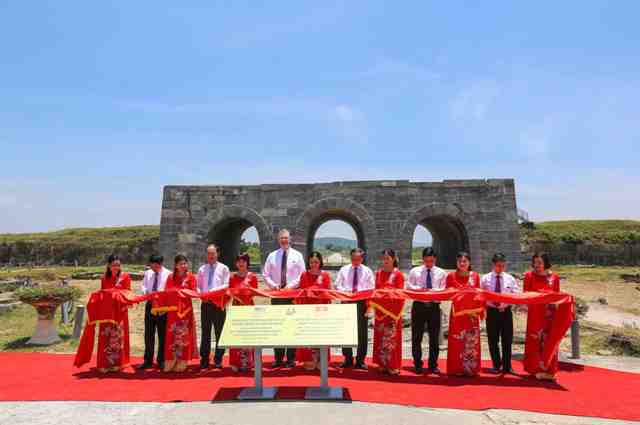 | Đại sứ Hoa Kỳ tại Việt Nam Daniel Kritenbrink và Phó Chủ tịch UBND tỉnh Thanh Hóa Nguyễn Đức Quyền cắt băng khánh thành dự án tu sửa mái vòm và bảo tồn cổng thành phía Nam, di sản Thành Nhà Hồ. (Ảnh: ĐSQHK) |