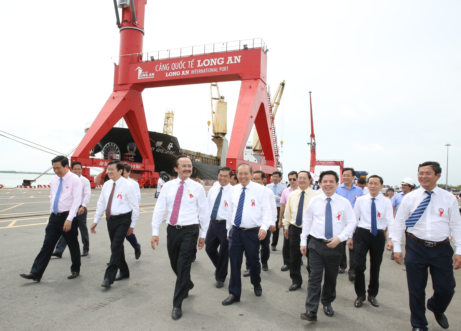 | Nguyên Chủ tịch nước Trương Tấn Sang; Phó Thủ tướng Thường trực Chính phủ Trương Hòa Bình và các đại biểu tham quan Cảng Quốc tế Long An. (Ảnh: VGP). |