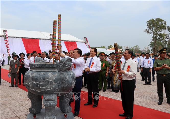 | Bí thư Trung ương Đảng, Trưởng ban Tuyên giáo Trung ương Nguyễn Trọng Nghĩa, cùng các đồng chí nguyên lãnh đạo Đảng, Chính phủ và chính quyền địa phương cắt băng khánh thành Khu chứng tích chiến tranh Rừng tràm Bang Biện Phú và Đền thờ anh hùng liệt sỹ, người có công huyện Vĩnh Thuận. Ảnh: Văn Sĩ/TTXVN |
