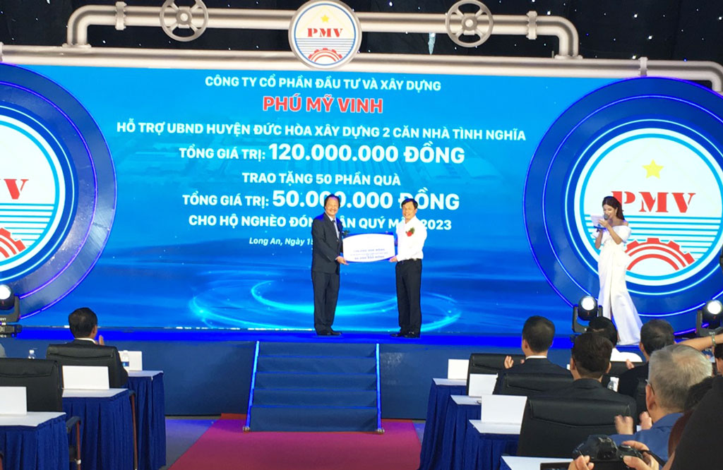 Dịp này, Cty Phú Mỹ Vinh cũng trao tặng 2 căn nhà tình nghĩa và 100 phần quà tết cho 2 huyện Đức Hoà và Bến Lức trị giá 220 triệu đồng./.