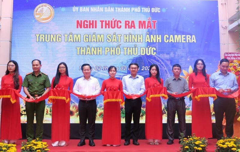 | Các đại biểu cắt băng khánh thành Trung tâm giám sát hình ảnh camera TP Thủ Đức. (Ảnh: PV) |