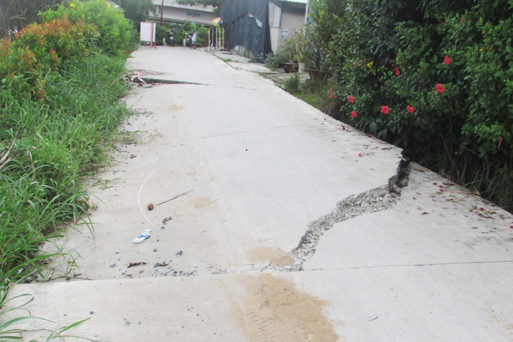 Mặt đường tuyến đê bị vỡ nứt, sụp xuống từng mảng