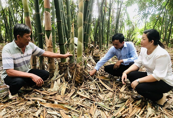 Lãnh đạo Ban Dân vận Quận ủy Cái Răng (bìa phải) tìm hiểu hiệu quả mô hình “Xây dựng Tổ hội nghề nghiệp trồng tre tứ quý” của Hội Nông dân phường Tân Phú.