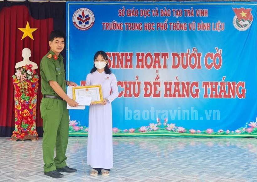 Công an thị trấn Châu Thành, huyện Châu Thành đã trao tặng giấy khen của Chủ tịch UBND thị trấn Châu Thành và biểu dương gương “người tốt, việc tốt” đối với em Phan Bảo Ngân, học sinh lớp 12, Trường THPT Vũ Đình Liệu (thị trấn Châu Thành).