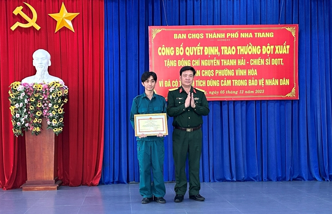 Theo đó, Ban Chỉ huy Quân sự (CHQS) Thành phố Nha Trang tổ chức trao Giấy khen của Bộ CHQS tỉnh và Ban CHQS Thành phố cho ông Nguyễn Thanh Hải, dân quân thường trực Ban CHQS phường Vĩnh Hòa (Thành phố Nha Trang) vì đã có hành động dũng cảm truy bắt đối tượng trộm cắp tài sản trên địa bàn; trao Giấy khen của Ban CHQS thành phố cho Ban CHQS phường Vạn Thạnh (Nha Trang) vì đã có thành tích xuất sắc trong việc phối hợp với lực lượng công an bắt giữ thành công đối tượng có lệnh truy nã.