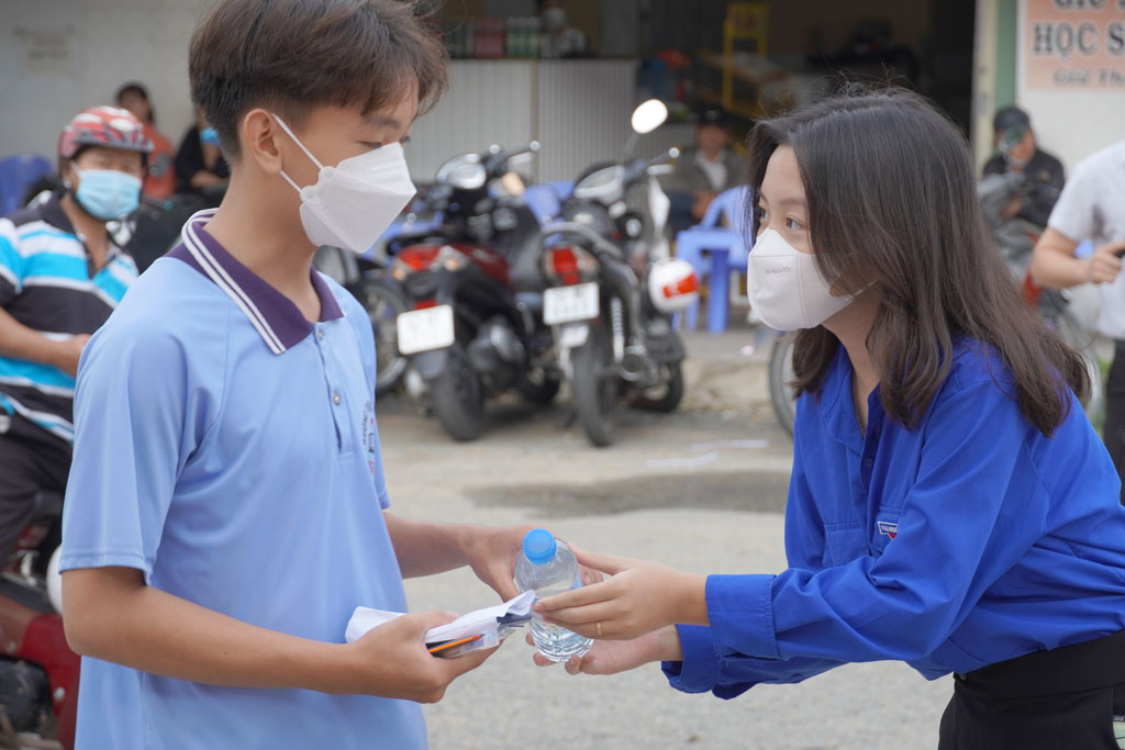 Đội tiếp sức mùa thi phát nước cho thí sinh trước mỗi buổi thi