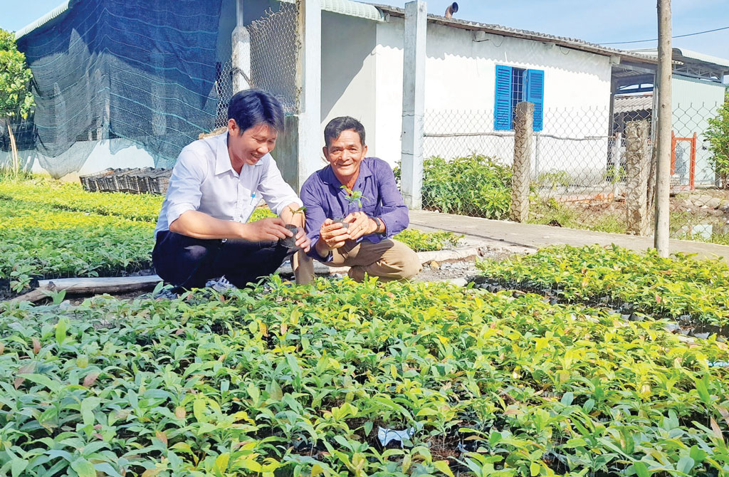 Ông Lương Văn Nhỏ giới thiệu về vườn ươm mai giống với Chủ tịch Hội Cựu chiến binh xã Tân Thành