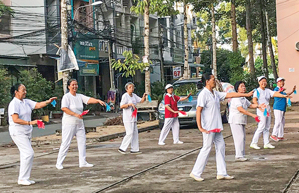 Khi có sự chủ động về thời gian, cuộc sống riêng, nhiều phụ nữ lớn tuổi thường tìm niềm vui trong du lịch, họp mặt bạn bè, sinh hoạt các câu lạc bộ, thể dục... Trong ảnh: Các cô tập dưỡng sinh tại phường An Khánh, quận Ninh Kiều.