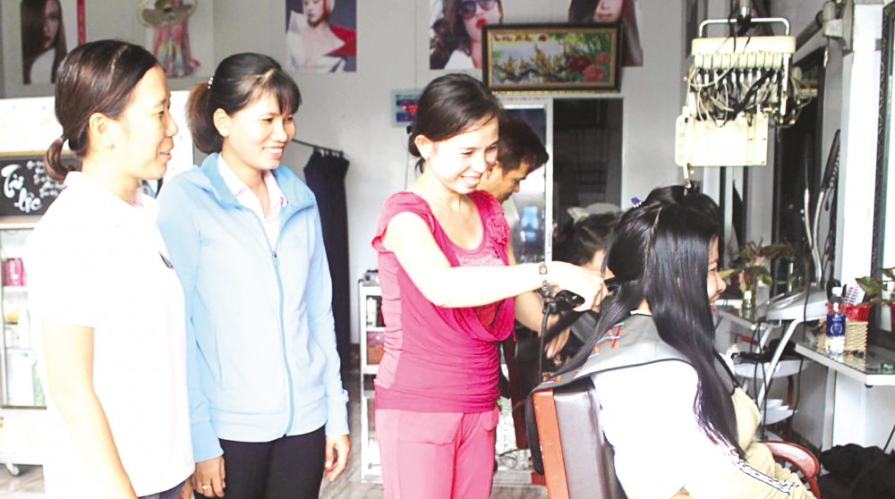 Chị Huỳnh Thị Pha (bìa trái) lấy lại tinh thần, tích cực tham gia công tác. Trong ảnh: Chị Pha thăm hỏi, tìm hiểu tình hình sản xuất, kinh doanh của chị em phụ nữ địa phương.