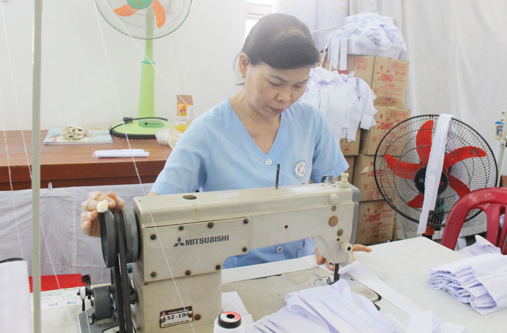 Có những hôm, chị Hoa kết thúc công việc vào lúc 18-19 giờ. “Chúng tôi chia thành nhiều nhóm phụ trách từng công đoạn, người thì cắt, người thì may, người đóng gói, khử trùng. Khẩu trang được may 2 lớp theo quy chuẩn của Bộ Y tế, tiệt khuẩn sạch sẽ, không có mùi khó chịu và phân phối đến các khoa, phòng” - chị Hoa cho biết thêm.