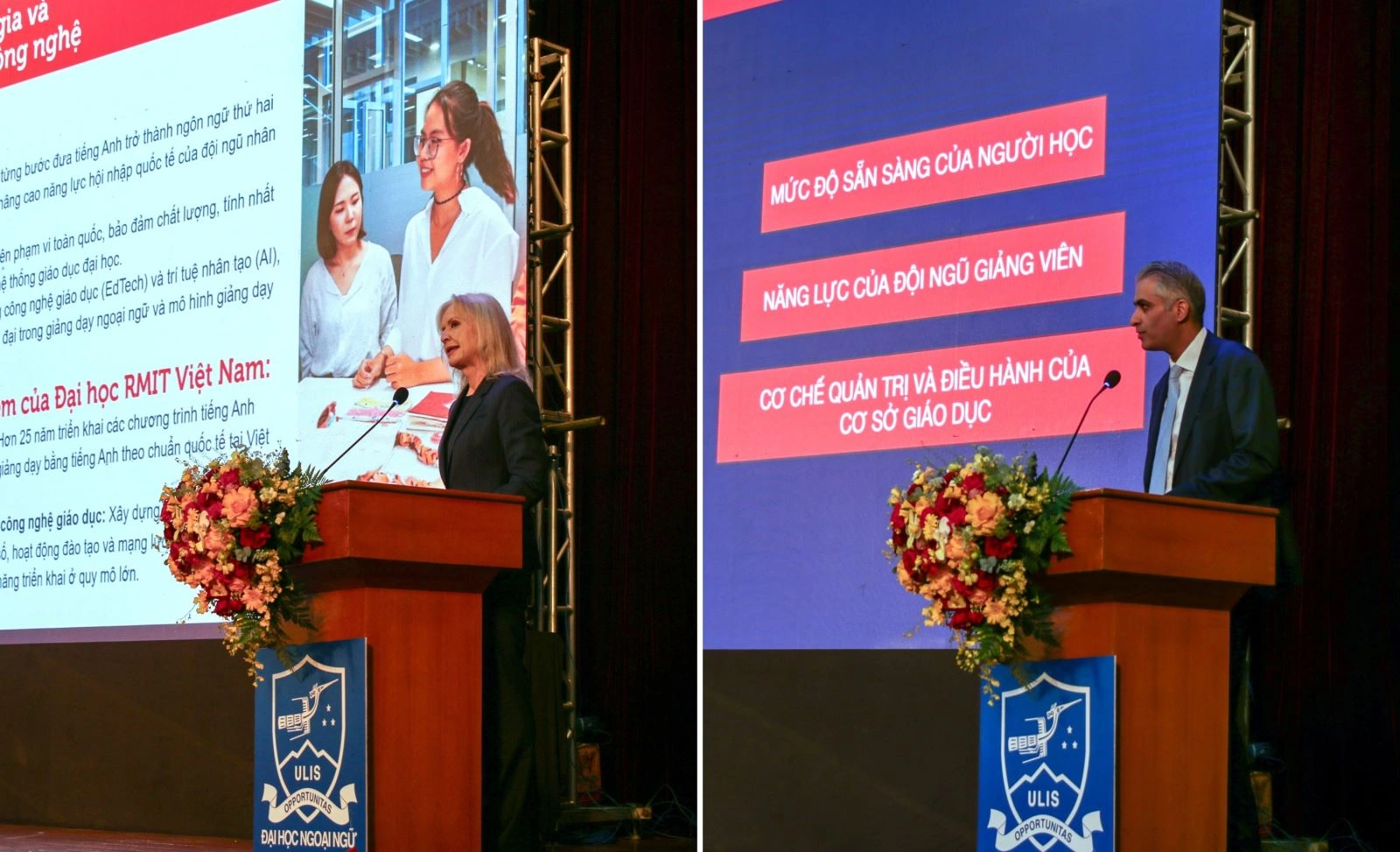 Giáo sư Iwona Miliszewska, Trưởng khoa Khoa học, Kỹ thuật và Công nghệ cùng ông Hossein Davari, Trưởng khoa Tiếng Anh và Chuyển tiếp đại học (Đại học RMIT Việt Nam) trình bày tại hội thảo quốc gia, với chủ đề “Giải pháp công nghệ trong thực hiện chủ trương đưa tiếng Anh trở thành ngôn ngữ thứ hai trong giáo dục đại học”. Ảnh: BTC