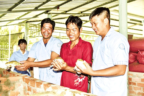 Anh Phan Văn Phê (bìa phải) tham quan trại nuôi ếch thương phẩm của thanh niên trong xã.