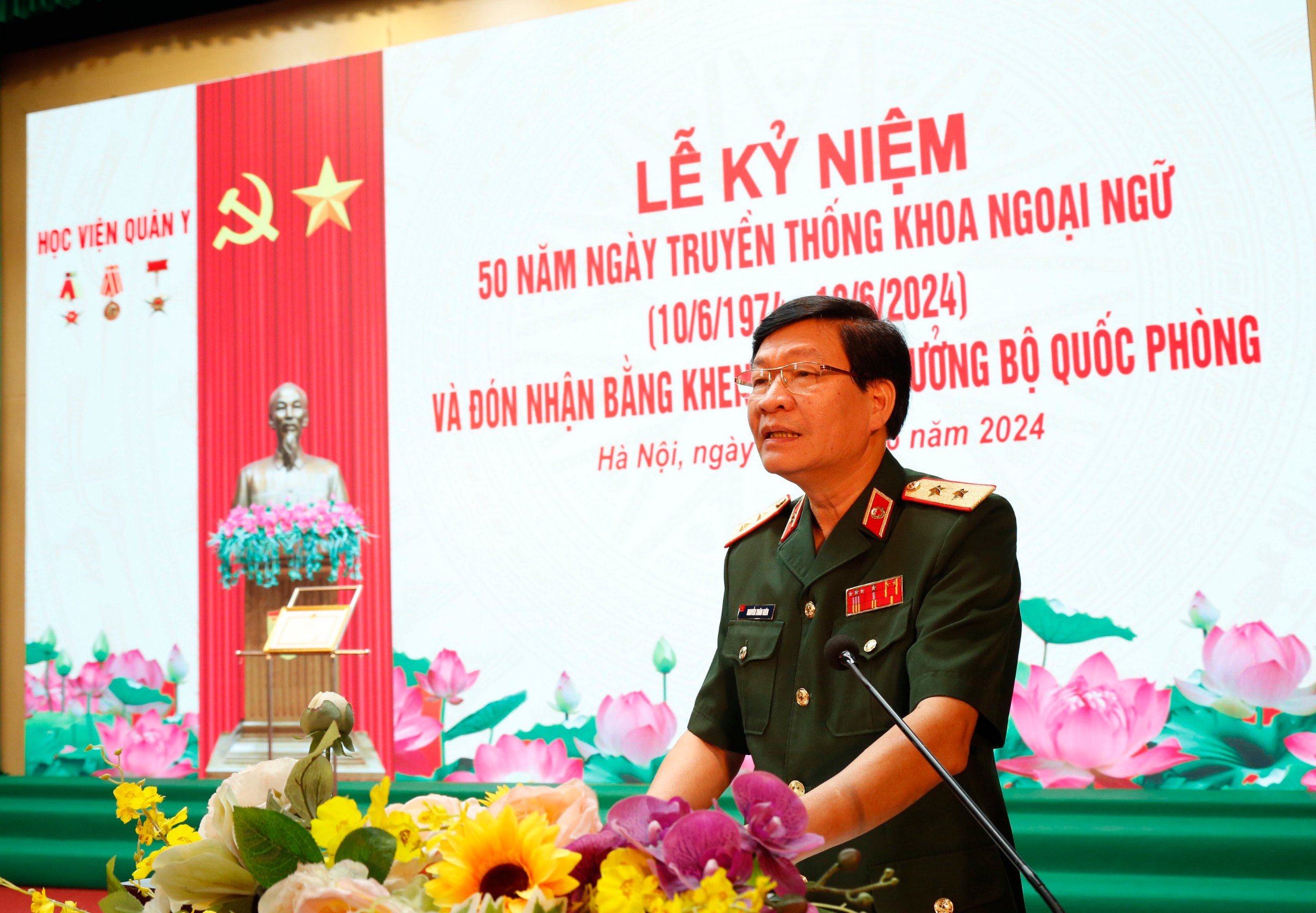 Phát biểu chúc mừng tại Lễ kỷ niệm, thay mặt Đảng ủy, Ban Giám đốc Học viện Quân y, Trung tướng, PGS, TS Nguyễn Xuân Kiên, Giám đốc Học viện ghi nhận, biểu dương những thành tích Khoa Ngoại ngữ đã đạt được trong 50 năm qua. Đồng chí Giám đốc Học viện cũng yêu cầu, Khoa Ngoại ngữ thường xuyên quán triệt, triển khai thực hiện nghiêm túc, chất lượng, hiệu quả nghị quyết lãnh đạo của các cấp ủy đảng, trọng tâm là Nghị quyết Đại hội đại biểu Đảng bộ Học viện lần thứ XXII và Nghị quyết Đại hội Chi bộ Khoa nhiệm kỳ 2020 - 2025; trong đó cần quán triệt, thực hiện tốt các nghị quyết liên quan đến giáo dục, đào tạo ngoại ngữ; tiếp tục đổi mới nội dung, phương pháp giảng dạy, chủ động cập nhật, bổ sung chương trình đào tạo theo hướng chuẩn hóa, hiện đại hóa, phù hợp với các đối tượng, phấn đấu để học ngoại ngữ trở thành phong trào, nhu cầu tự thân của mỗi cán bộ, giảng viên và học viên ở Học viện. Tích cực, chủ động nghiên cứu khoa học, tập trung đẩy mạnh nghiên cứu cơ bản, chú trọng nghiên cứu những công trình khoa học phục vụ trực tiếp cho công tác giảng dạy của Khoa và giáo dục, đào tạo của Học viện; tiếp tục duy trì tốt mối quan hệ với các cơ sở giáo dục ngoài Học viện để có thể giao lưu, trao đổi nội dung, chương trình, phương pháp giảng dạy và nghiên cứu khoa học. Thường xuyên xây dựng mối đoàn kết, thống nhất trong lãnh đạo, chỉ huy và toàn đơn vị; xây dựng tập thể Khoa thực sự là một khối đoàn kết thống nhất về ý chí và hành động trong quá trình triển khai thực hiện nhiệm vụ; xây dựng cấp ủy, chi bộ trong sạch vững mạnh, tiêu biểu, đơn vị vững mạnh toàn diện “Mẫu mực, tiêu biểu”.
