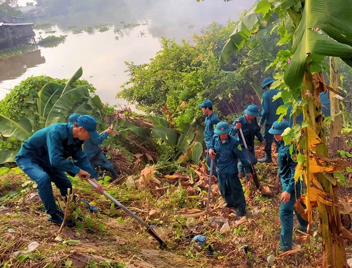 Dân quân quận Ô Môn tham gia vệ sinh môi trường trong Tết Quân Dân năm 2024.