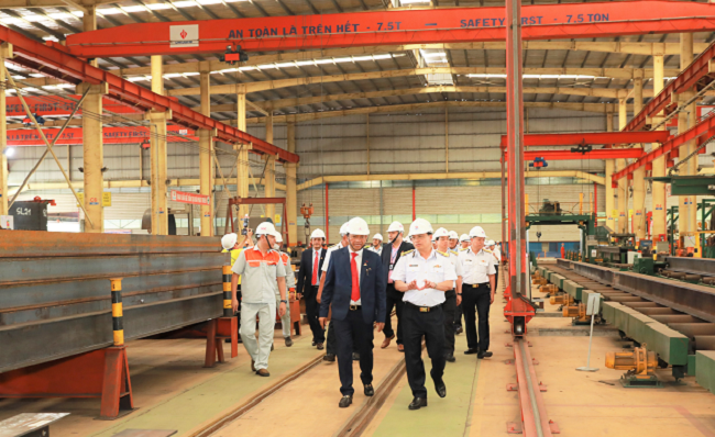 | Các đại biểu tham quan nhà máy đóng cẩu RTG. (Ảnh: Công Hoan) |