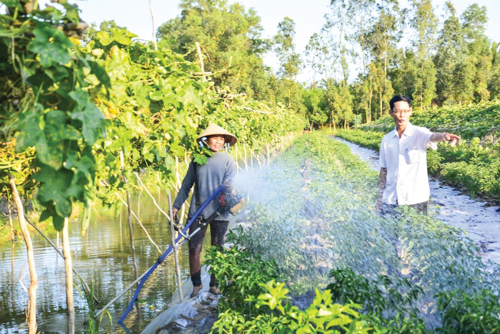Chị Võ Bích Vân tưới nước cho liếp ớt.