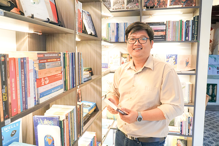 Anh Đông Hân và các kệ sách trong quán.
