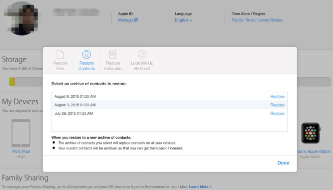 Đối với danh bạ, bấm chọn "Restore Contacts" sẽ ghi đè lên toàn bộ dữ liệu danh bạ đang có trong tất cả thiết bị của bạn – bao gồm máy Mac, iPhone, iPad và iPod touch. Tuy nhiên, Apple rất chu đáo khi tạo ra một bản sao lưu (backup) của danh bạ hiện tại ngay trước khi việc khôi phục được tiến hành, để bạn có thể quay lại “phiên bản cũ” này bất cứ lúc nào.