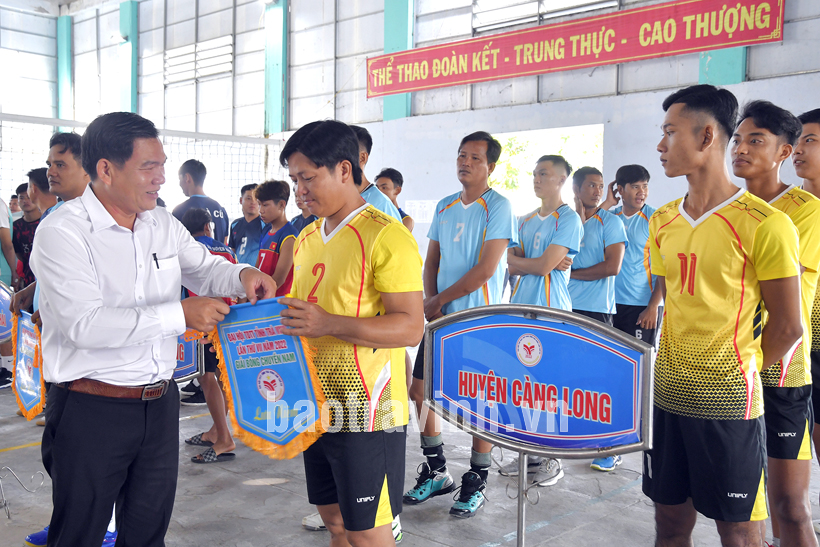 Ông Dương Hoàng Sum, Giám đốc Sở Văn hóa, Thể thao và Du lịch Trà Vinh trao cờ lưu niệm cho các đội bóng tham gia giải.