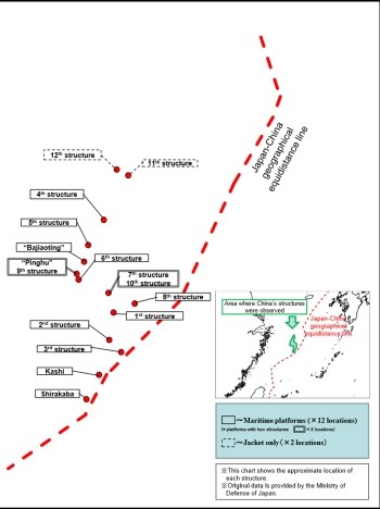 “Nhật Bản đã nhiều lần gửi công hàm phản đối hành động đơn phương khai thác tài nguyên của Trung Quốc và yêu cầu nước này ngừng ngay hoạt động xây dựng các công trình thăm dò và khai thác dầu khí lại”, cuốn Sách trắng quốc phòng nêu rõ.