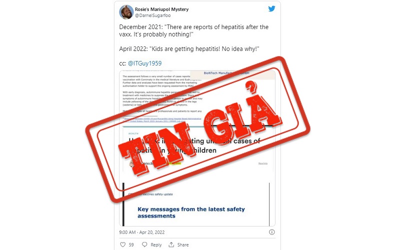 Một tài khoản Twitter ngày 20/4 đăng bài viết có nội dung: “Tháng 12/2021: Có nhiều báo cáo về các trường hợp mắc viêm gan sau khi tiêm vaccine Covid-19. Có lẽ là không sao! Tháng 4/2022: Nhiều trẻ em đang mắc viêm gan. Không biết lý do là gì!”