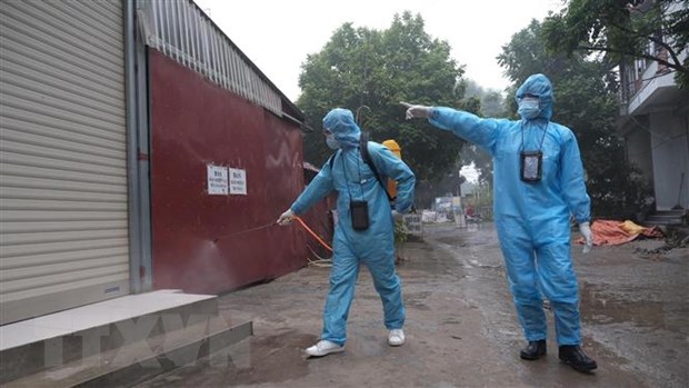 Nhân viên y tế phun khử khuẩn tại khu vực gần ca nghi nhiễm. (Ảnh: Phạm Hùng/TTXVN phát)