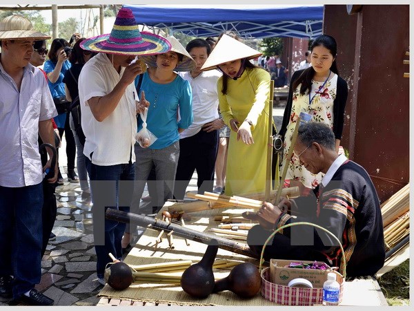 Du khách tham quan không gian trình diễn và chế tác các nhạc cụ dân tộc Êđê. (Ảnh: Thanh Hà/TTXVN)