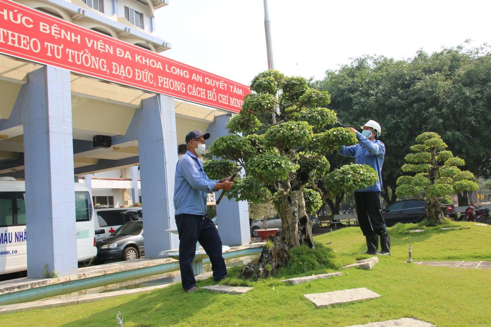 Cây xanh tại Bệnh viện Đa khoa Long An được cắt tỉa, tạo hình xinh xắn