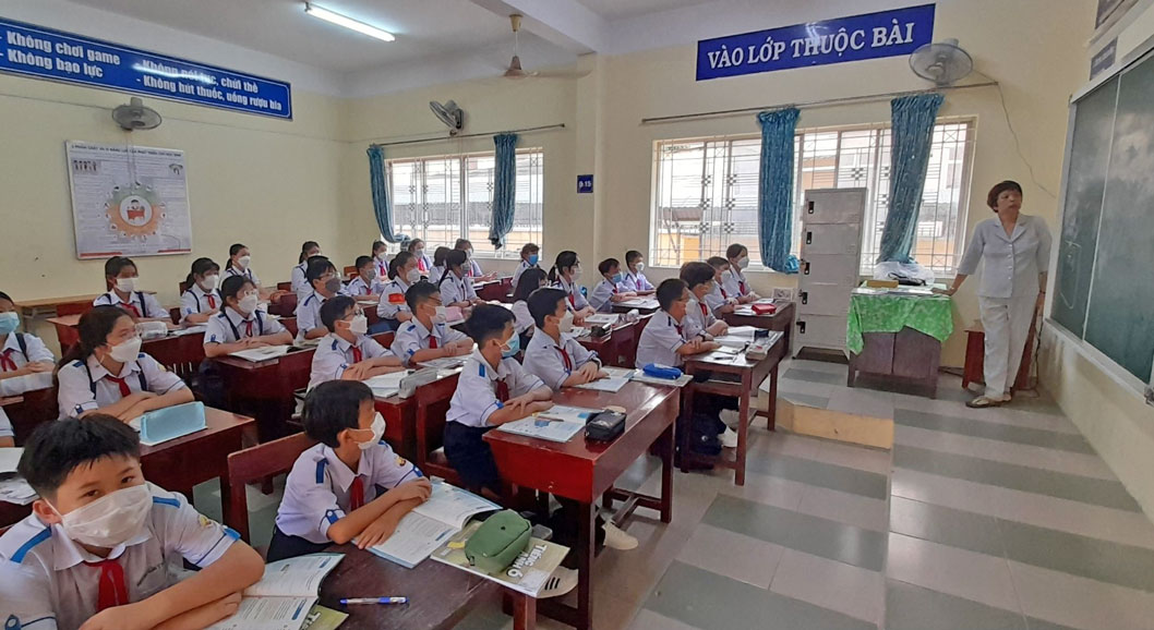 Học sinh Trường THCS Nhựt Tảo vẫn đeo khẩu trang trong quá trình học tập trong năm học mới