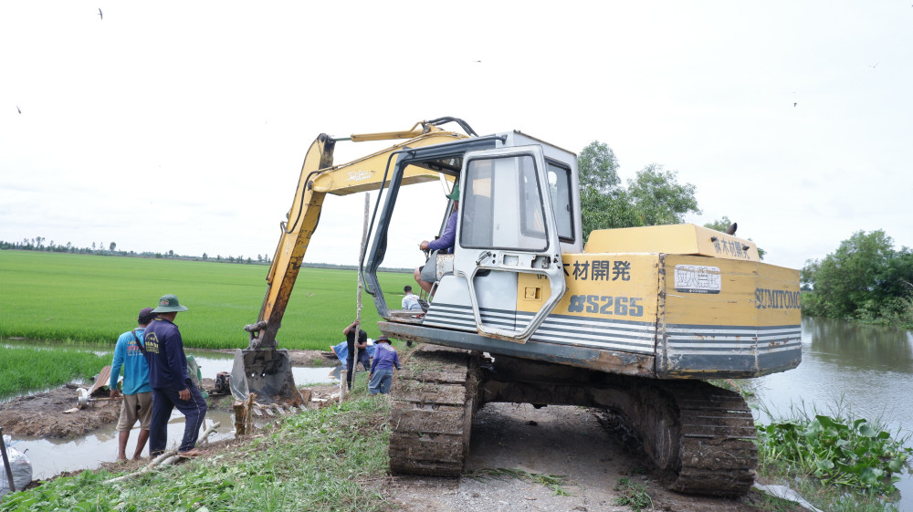 Người dân ấp Cả Gừa, xã Tuyên Thạnh, gia cố một đoạn đê bị nứt, nước đang rò rỉ vào nội đồng