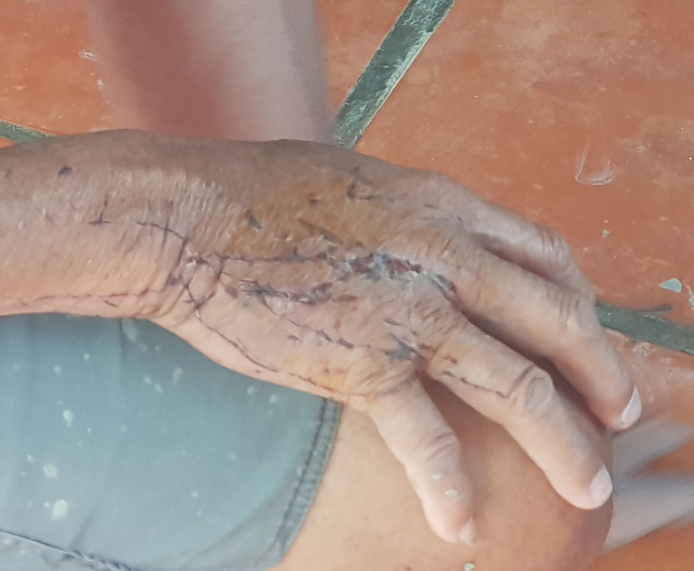 Ông Trần Văn Chiêu với vết cắn trên tay do con mèo gây ra