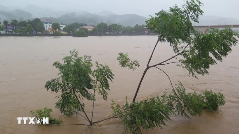 Mực nước trên sông Hồng, đoạn qua thành phố Lào Cai lên tới 83,91m, cao trên báo động 3 là 0,41m. (Ảnh: Hương Thu/TTXVN)