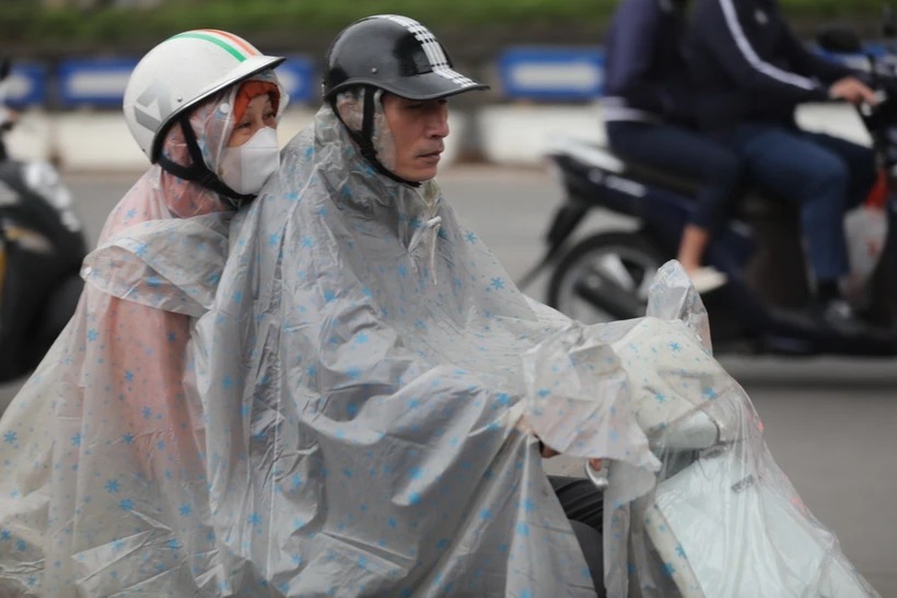 Do thời tiết có gió lạnh kèm mưa nên nhiều người mặc áo mưa khi tham gia giao thông trên. (Ảnh: Thanh Tùng/TTXVN)