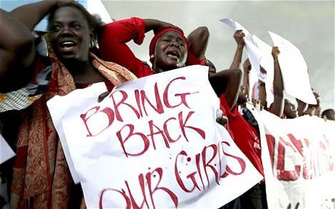 Thân nhân các nữ sinh bị Boko Haram bắt cóc biểu tình yêu cầu chính phủ Nigeria tìm kiếm và giải cứu con của họ. (Ảnh: Telegraph)