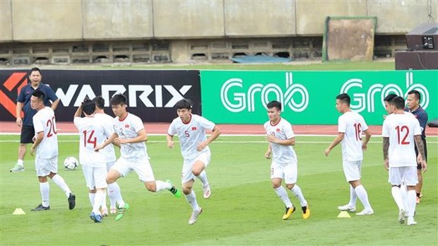 Các cầu thủ trong bài tập khởi động trên sân Thammasat. (Ảnh: Hoàng Linh/TTXVN)