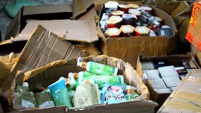 Số hàng hóa mỹ phẩm không rõ nguồn gốc, xuất xứ bị cơ quan chức năng thu giữ. (Ảnh: Lê Thúy Hằng/TTXVN)