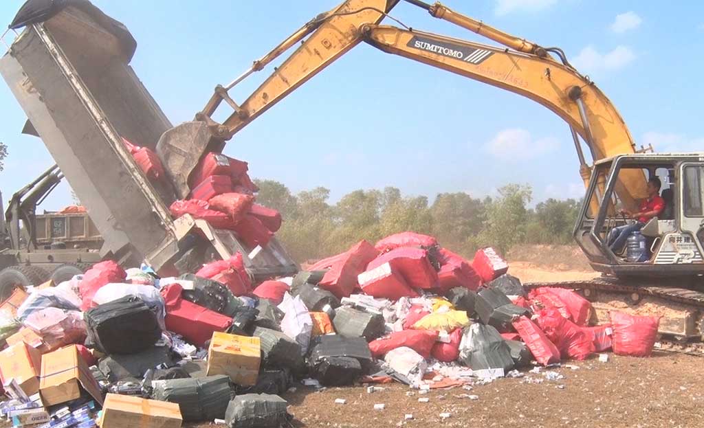 Thuốc lá nhập lậu bị tịch thu, tiêu hủy trên địa bàn huyện Đức Hòa. Ảnh : Hoàng Lê