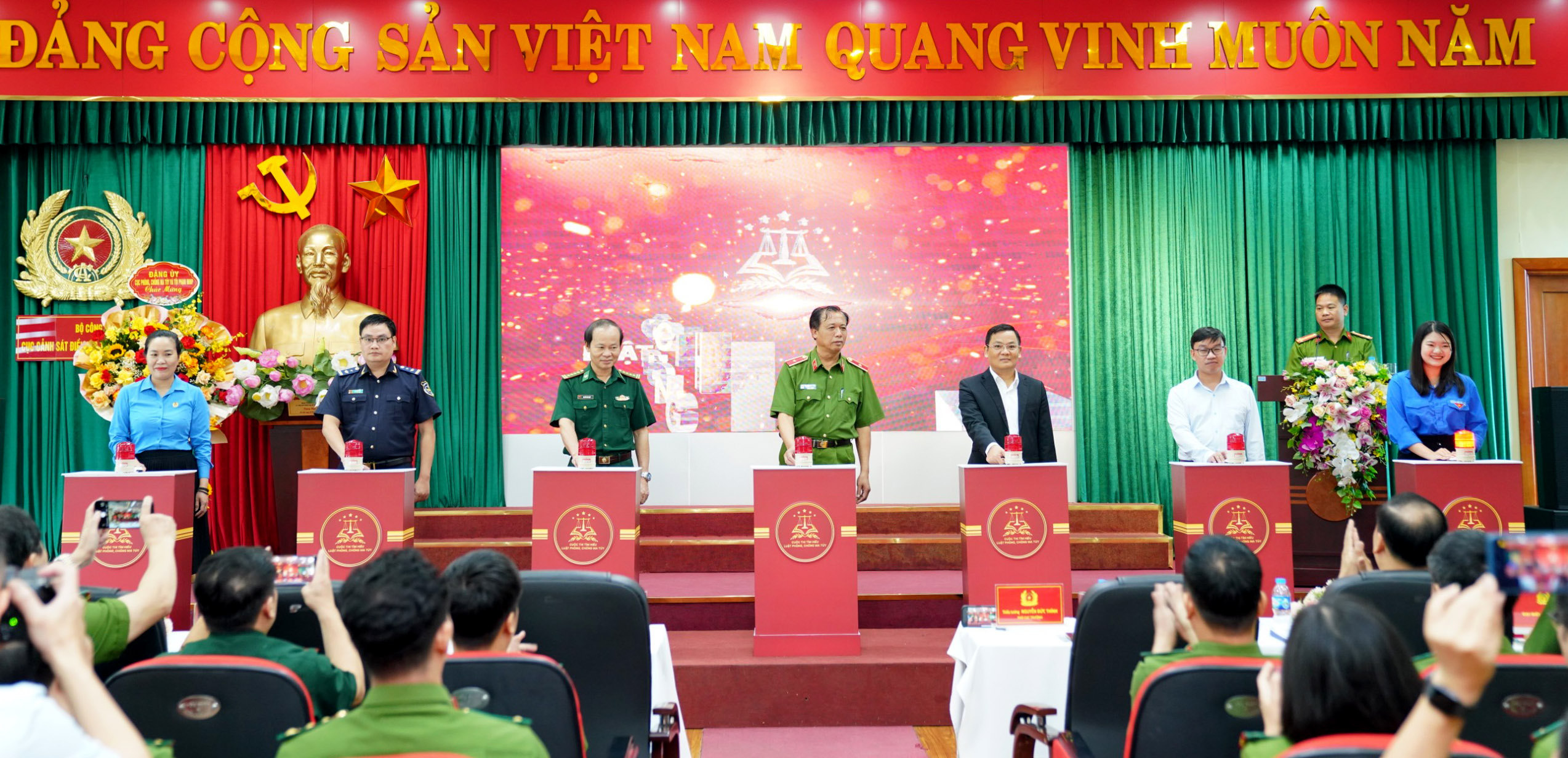 | Các đại biểu bấm nút khởi động cuộc thi Tìm hiểu Luật Phòng, chống ma túy. |