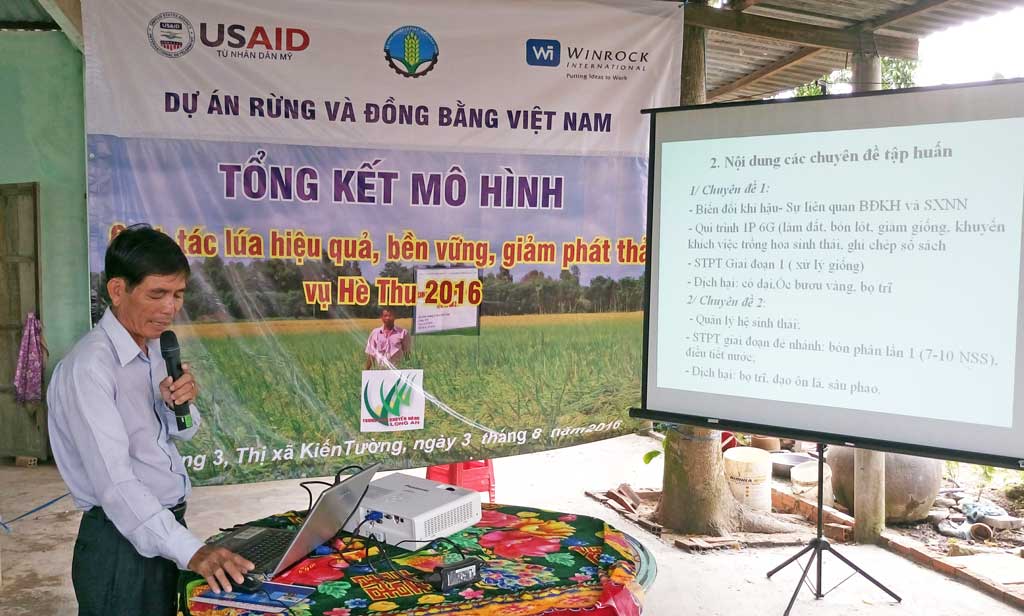 Mô hình này thuộc dự án “Rừng và đồng bằng Việt Nam” được triển khai tại khu phố 4, phường 3, thị xã Kiến Tường với diện tích 0,5ha, giống lúa trình diễn là giống RVT với cơ cấu đất sản xuất 2 vụ/năm.